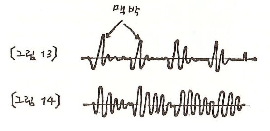 따라서 C열에 나타난 조개 모양은 일정한 진폭을 가진 기본음의 〈변조(變調)>이다. 변조란 주파수와 진폭이 일정한 파동에 변화를 일으키는 것을 말한다. 여기서는 그것이 매초 60사이클과 매초 50사이클인 파동의 진폭이 증가하거나 감소하는 것을 의미한다.