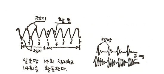 바꾸어 말해, A각이 순간적으로 열렸다가 다시 객관적인 시간과 평행하도독 되돌아와서 닫힌다. 이러한 일은 한번의 운동 주기당 위 아래 두 지점에서 정지하므로 초당 14회 정도 일어난다.