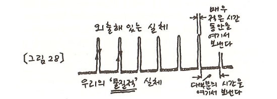 추가 완전히 정지한 지점과 다시 왕복운동을 시작하려는 지점 사이에 시간과 공간의 인과관계가 깨어지는 지역이 있다는 것을 우리는 알았다. 이 지역에서는 추의 위치가 <애매해져서> 무한이나 무한에 가까운 속도가 된다. 왜냐하면 양자 크기의 물질에서는 불확정성의 원리가 작용하기 때문이다.