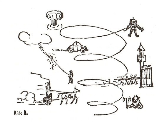 이쯤에서 두개의 시공간 좌표로부터 배운 사실을 정리해보자. [그림 23]에서 알 수 있는 것은, 무엇인가 빠르게 움직일수록 수평축에 더욱 가까와진다는 것이다. 즉 <공간형(空間形> 행동을 하게 된다는 것이다. 그리고 [그림 25]를 통해서는 주관적 시간측이 수평으로 기울어질수록 주관적인 시간을 더 많이 가지게 된다는 것을 알 수 있다.