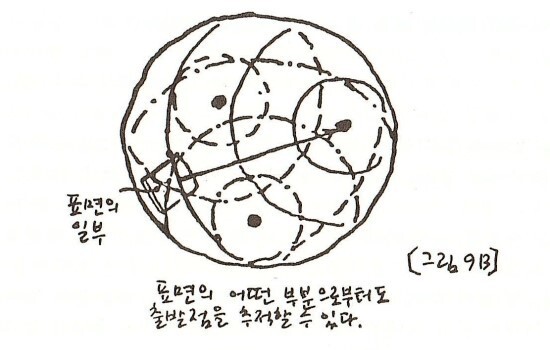 우리는 그것을 이렇게 표현할 수 있다. 즉, 각각의 조약돌에서 발생한 물결의 원은 물 표면의 모든 지점을 다 지나갔으며, 따라서 아무리 작은 얼음조각이라도 그 조각 속에 남아 있는 원의 일부분을 추적해 들어가면 그 원의 근원을 알 수 있다〔그림 98].