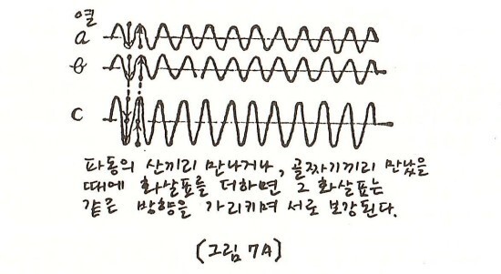 파동 a와 b의 형태 위에 조개 모양의 파동이 얹혀 있는 모습을 볼 수 있다. [그림 7C]를 자세히 살펴보면 이런 현상이 일어나는 이유가 분명해진다.