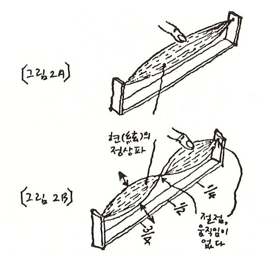 정상파는 끈의 길이를 정수배(整數倍)로 나눈 위치에서 끈을 튕겼을 때에만 얻어진다. [그림 2A]에서는 틀의 길이가 한 파장(波長)의 절반 길이에 해당하고, [그림 2B]에서는 틀의 길이가 완전한 파장의 길에 해당한다.
