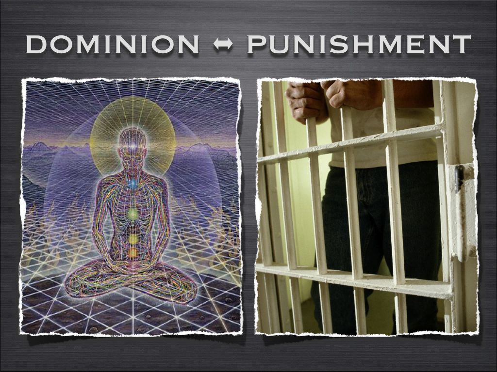 그다음은 내면의 지배(dominion)와 형벌에 대한 두려움(fear of punishment)의 혼동입니다. 왼쪽 사진은 자신의 내면을 지배하고 있는 사람의 모습입니다. (내면의 빛을 모두 활성화하고 근원 자아와 하나가 된 모습이죠). 이 자는 형벌에 대한 행동을 기준으로 삼지 않습니다. 인간의 법이 아닌 양심, 자연의 법칙, 우주의 섭리를 기준으로 행동합니다. 형벌 때문에 어떤 행동은 취하지 않고 어떤 행동은 하는 것이 가장 낮은 의식 수준의 표출입니다.
