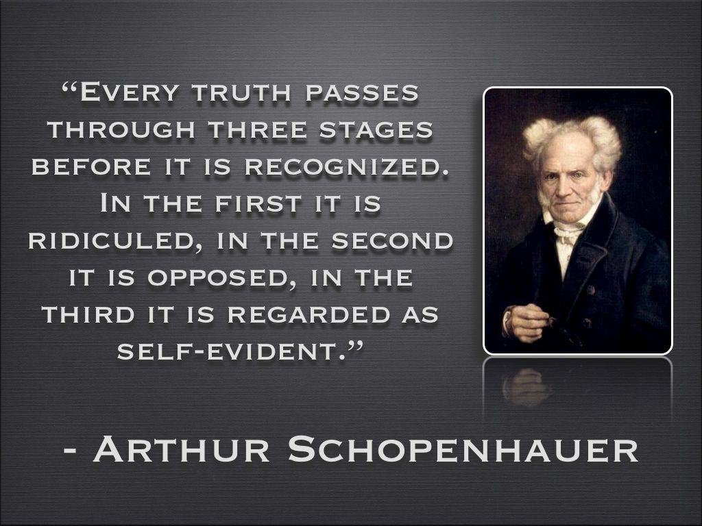진실은 받아들여지기 전, 세 가지 단계를 거친다. 첫 번째 조롱당하고, 두 번째 저항에 부딪히며, 셋째 자명한 것으로 여겨진다. - 쇼펜 하우어