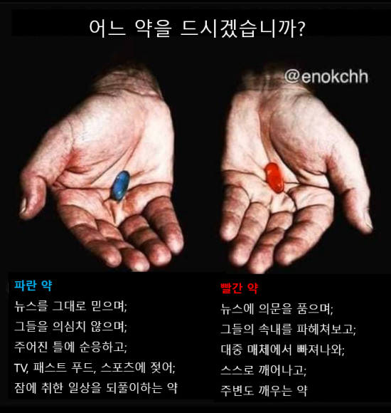 위 사진은 영화 매트릭스에서 현실의 포장된 모습이 아닌 현실 그대로의 고통스러운 '진실'에 대해서 설명하는 장면입니다. 영화상에서 인간은 로봇의 배터리이자 노예로 사용되고 인간은 매트릭스라는 꿈속의 세계에서 그런사실도 모른채 잠들어 있습니다. 이 사실을 처음 접한 주인공 네오는 끔찍한 현실을 받아들이지 못하고 부정하죠. 이것은 실제 우리세계를 비유한 장면입니다. 엘리트 지배계층의 노예로 사는줄도 모르고 끔찍한 진실을 외면한채 믿고싶은걸 믿으며 살아가고 있습니다. 의식이 깨어나는 첫 번째 방법은 현실을 받아들이는 겁니다. 포식자가 나타났을때 타조가 모래에 머리를 파묻는 행동처럼 진실을 외면해도 포식자는 우리를 삼키기 위해 다가오고 있습니다.