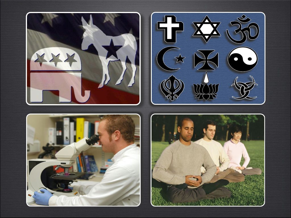 사람들은 진실을 구하기위해 위의 4가지 시스템을 찾게됩니다. 정치, 과학, 종교, 뉴에이지 입니다. 마크는 4가지 사상을 빅4라고 규정하였습니다. 실제로 이 4가지 시스템은 의식을 가둘수있는 시스템들 입니다. 일종의 패러다임 말입니다. 이 빅4중에서 하나만을 통해 진실을 구한다면 어느것을 선택하더라고 진실 전체를 볼 수가 없습니다. 시스템들은 사고를 한정시키는 상자입니다. 진실은 하나의 상자안에 가둘수 없습니다. 위의 시스템들이 완전하게 잘못된것은 아니지만 진정으로 진리를 구한다면 다양한 관점이 필요합니다.