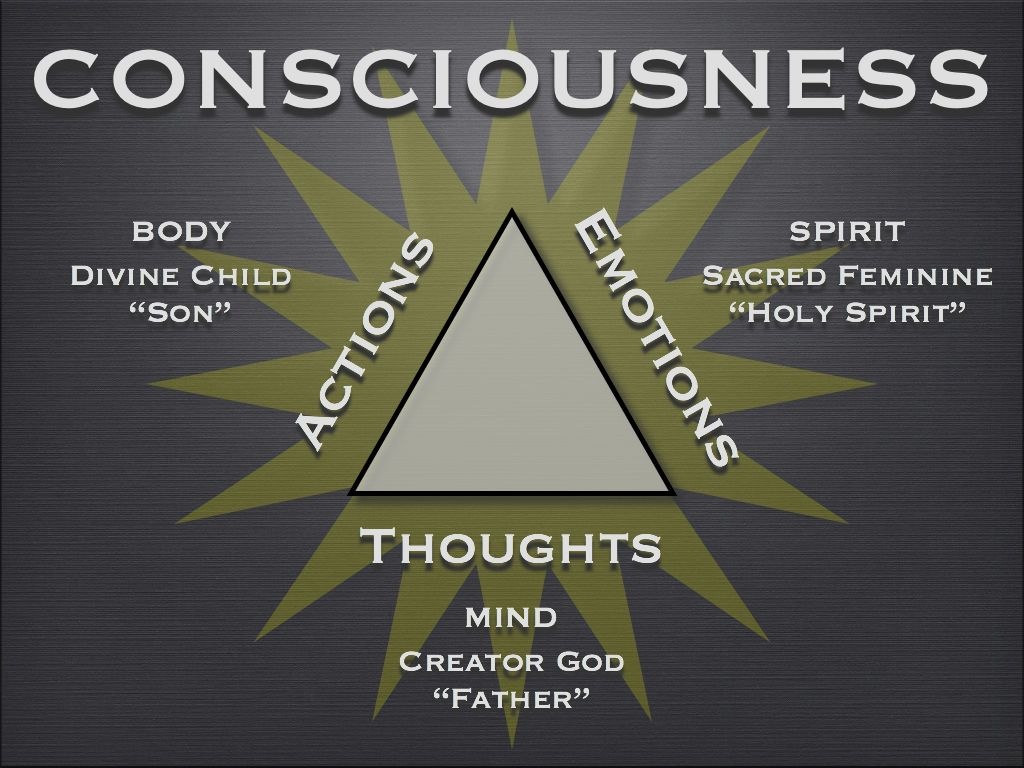 다음은 의식의 3요소 입니다. 삼각형은 상징적으로 많은것을 의미합니다. 불, 남성, 기독교의 삼위일체 (성부 성자 성령)등. 그중 인간속성의 3요소적인 부분인 행동, 감정, 생각의합 입니다. 먼저 생각은(Thoughts) 모든 경험을 만들어 냅니다. 이 세상에 존재하는 모든것은 처음에 누군가의 생각에서 시작했습니다. 생각은 셋중 가장 근원적이라고 볼 수 있고 삼위일체의 창조주 아버지에 해당합니다. 감정(Emotions)은 음의측면 입니다. 이것은 신성 여성성으로 삼위일체의 어머니 입니다. 감정이란 의식의 '내면화한 것' 즉, 내면에서 느끼는 무언가 입니다. 마지막으로 행동(Actions)은 생각과 감정의 기반으로 취하는 어떠한 행동입니다. 생각과 감정사이에서 태어난 자식 이기때문에 성자라고 합니다. 행동은 남성적 특징이 있기때문에 아들이라고 칭합니다. 셋중 가장 하위 물질차원과 가깝습니다.