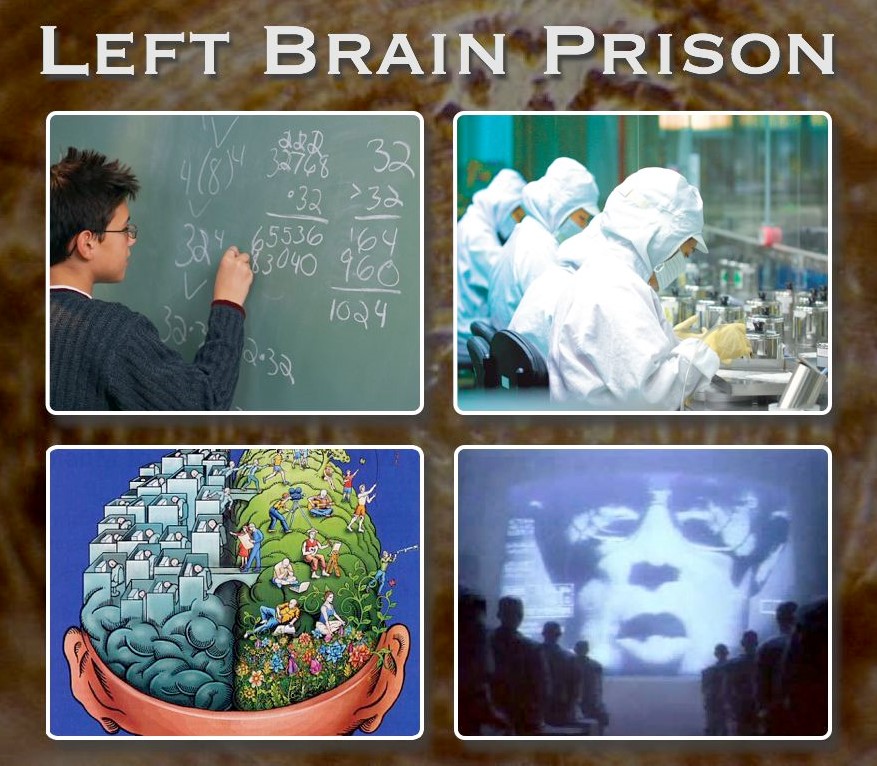 위 그림은 좌우뇌의 모습을 풍자한 그림입니다. 좌뇌는 같은옷을 입은 기계적인 사람들이 동일한 일을 하고있고 우뇌는 예술적이고 창의적인 총체적 관점에서 활동하고 있습니다. 우리의 교육과 문화는 우뇌성향의 사람조차 좌뇌에 가두어 버립니다. 좌뇌는 물질적이고 눈에 보이는 세상외에는 무시하는 경향이 강합니다. 그리고 지배하고 통제하는것에 만족을 느끼는 공격적인 성향도 가지고 있습니다.