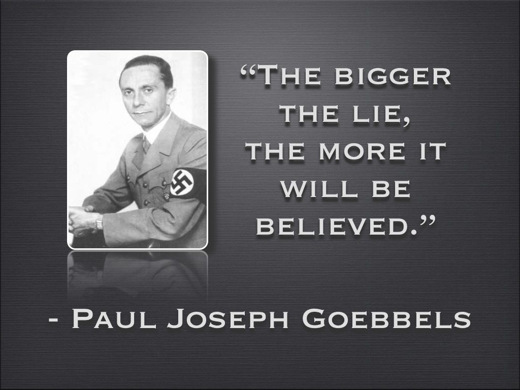 나치시절 거짓과 속임수라면 히틀러 못지않았던 나치 선전부장 파울 요셉 괴벨스는 큰 거짓말일수록 오히려 설득력이 있다고 했습니다. 사람이라는 존재의 믿음체계를 간파하고 진실보다 거짓을 믿게 하는 게 더 쉽다는 것을 알아내었고 지금 까지 이 기법은 더욱 널리 사용되고 있습니다.