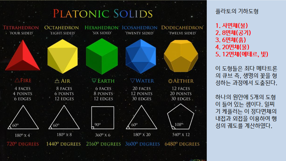 하나의 원에서 시작하여, 두 개의 원이 교차하여 원의 중심을 연결해 얻어낸 삼각형, 오각형, 육각형 등이 평면상 드러난다. 그러나 이것이 구형 안에서 입체로 관찰하면 정확하게 5개의 플라토의 기하학적 도형이 나오게 된다.