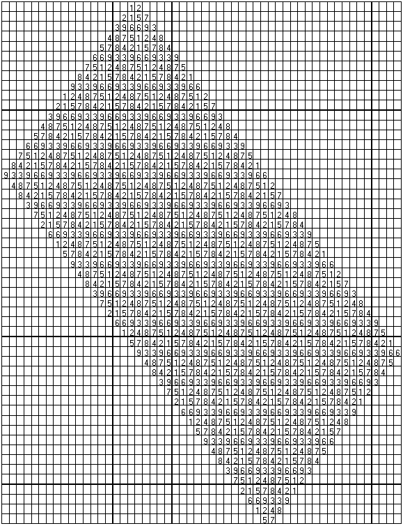 원안에 있는 수를 기준으로 1에서부터 9까지 곱을하면 화살표 방향으로 진행하면서 순환한다. 특이한 것은 3과 6은 오직 소스 삼각형을 이루며 3, 6, 9가 순환한다는 점이다. 나머지 1, 2, 4, 8, 7, 5가 자신의 순환 에너지를 3, 6, 9로 집중하고 있는 것을 볼 수 있다.