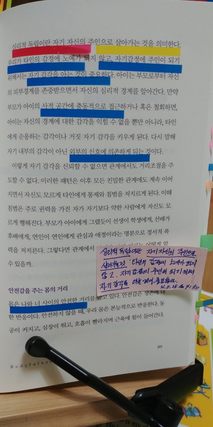 공생기 습성에서 벗어나기 위해서는 자신의 몸으로 돌아올 수 있어야 한다. 심리적 분리는 자신의 감각이 타인의 감각과 다르다는 것을 아는 것에서 시작된다. 그것은 곧 몸의 경계 boundary를 아는 것이다. 나와 상대의 몸이 다르듯이 나의 감정과 상대의 감정 또한 다르다는 것을 인정해야 한다. 이런 점에서 자신의 감정과 타인의 감정, 자신의 욕구와 타인의 욕구를 구분하는 것은 심리적 독립과 성장을 위해 중요한 인생의 과업. (50)