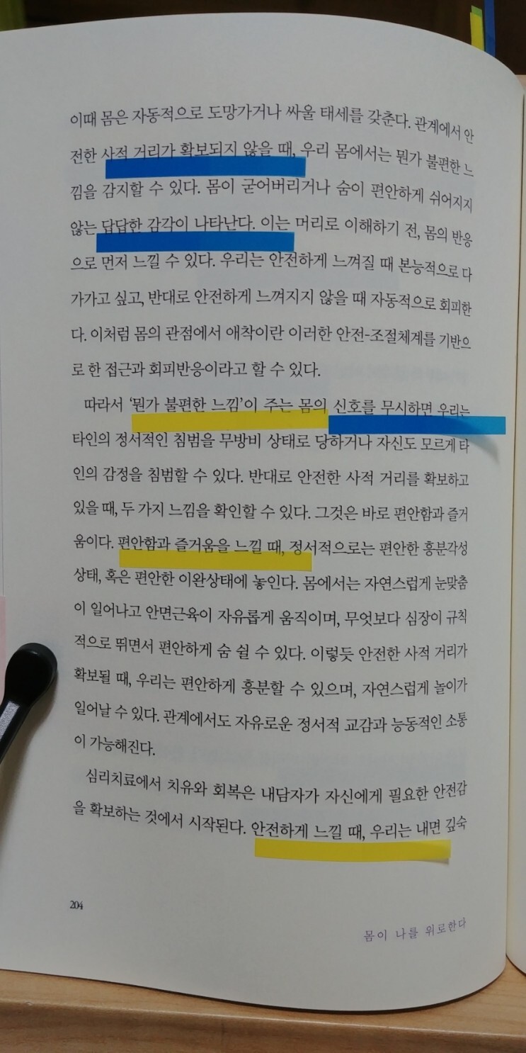 몸을 삶의 준거로 삼으려면 자신의 몸을 편안하게 감각할 수 있어야 한다. 특히 몸에 대한 즐거운 감각을 느끼는 것이 중요하다. 우리가 몸을 떠나는 가장 큰 이유는 고통을 느끼지 않으려고 하기 때문이다. 따라서 수치심이나 죄책감을 느끼지 않으면서 몸의 쾌감을 탐색하고 온전히 느낄 때, 자신의 몸과 더 친밀해질 수 있다. 자신의 몸과 친밀해지는 것은 누군가와 친밀해지는 과정과 유사하다. 몸에 가까이 다가가고, 몸이 좋아하는 것을 적극적으로 해보는 것이다. 내 몸이 언제, 어디에서 편안함과 즐거움을 느낄 수 있을까. 사람들은 의외로 화장실, 목욕탕, 산책길처럼 몸이 주체가 되는 공간에서 정신적인 자유로움을 얻는다. 의식이 본능을 방어하거나 누르지 않을 때, 열려 있는 몸으로 돌아와서 자유롭게 생각할 수 있기 때문이다. 바로 그런 순간에 정신적 영감이 일어날 수 있다. (117)