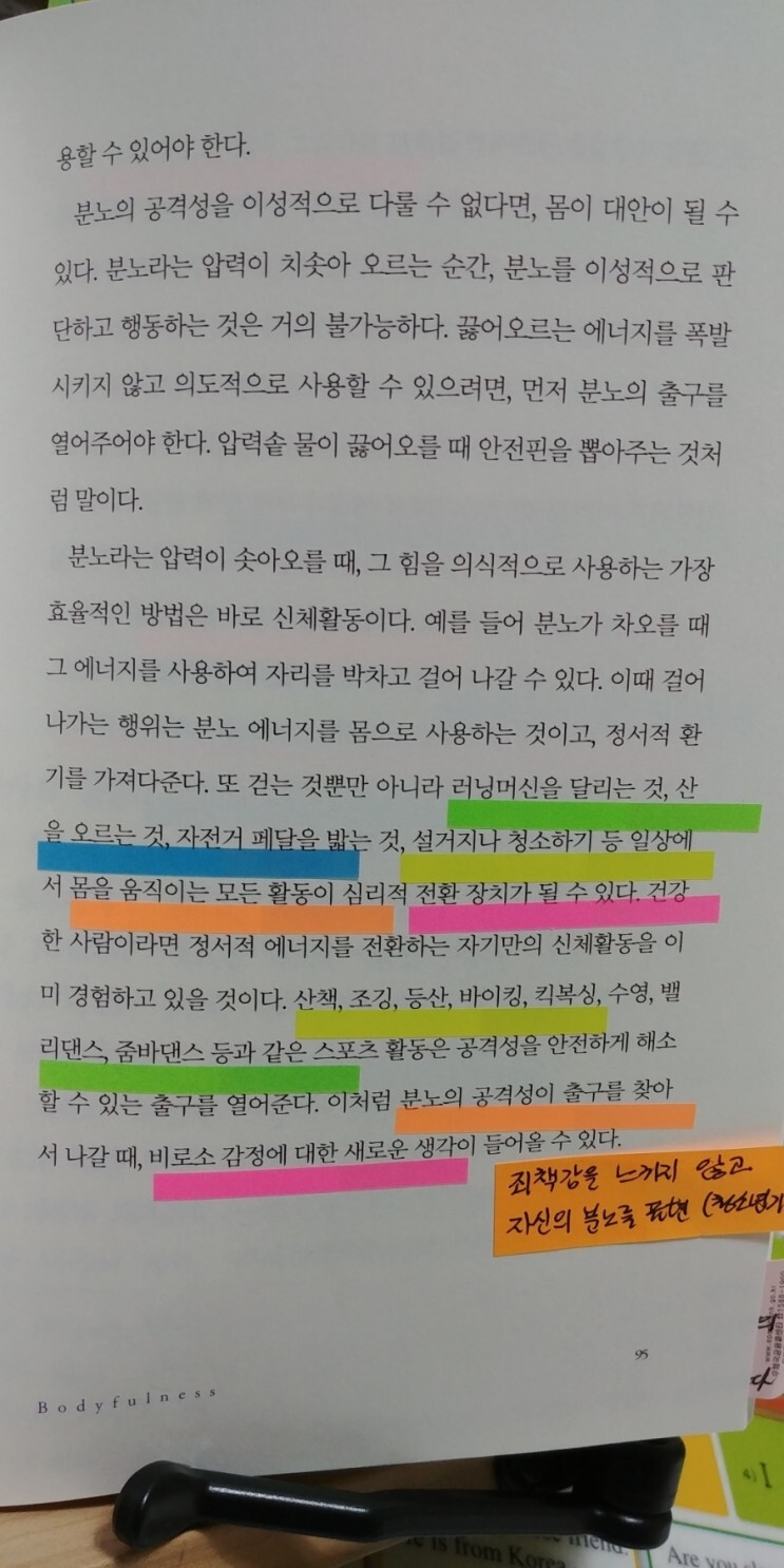 분노라는 압력이 솟아오를 때, 그 힘을 의식적으로 사용하는 가장 효율적인 방법은 바로 신체활동이다. (걷는 것, 러닝머신을 달리는 것, 산을 오르는 것, 자전거 페달을 밟는 것, 설거지나 청소하기 등 일상에서 몸을 움직이는 모든 활동) (95)