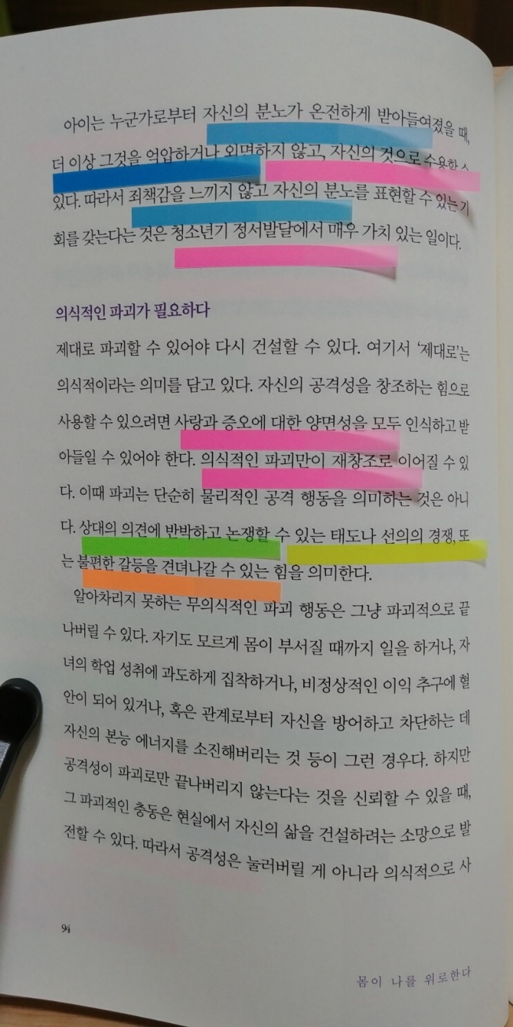 엄마를 도저히 미워할 수 없었다. 미워하기에는 엄마가 너무나 가엽고 불쌍했다. 엄마를 공격하기에는 엄마가 너무나 약하게 느껴졌다. 증오는 그 대상을 찾지 못하고, 결국 나 자신을 공격하고 처벌하기 시작했다. 이처럼 공격성이 자기 내부로 향할 때, 누구나 우울에 빠질 수 있다. 자기 자신을 공격하고 방어하느라 정신적인 에너지가 소진되기 때문이다. 그래서 우울한 몸은 분노하는 몸이기도 하다. 분노할 수 없어서 우울한 몸이 되는 것이다. (90)