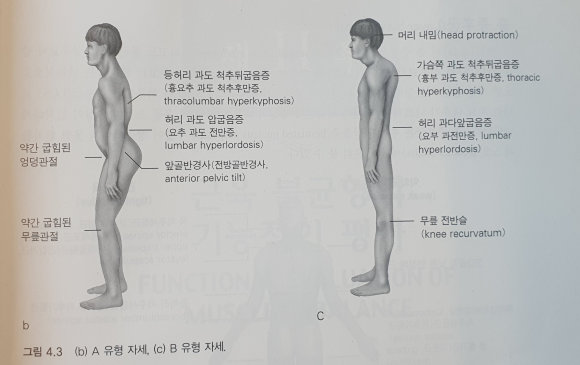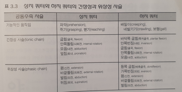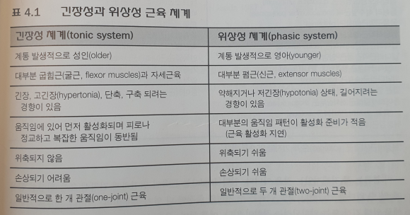 - 근육이 정적, 긴장성 또는 기능적 자세에서 우세한 근육은 기능적 움직임에서 긴장하려는 경향을 가지고, 동적이며 위상성 근육은 기틍적 움직임에서 약화되려는 경향을 가지고 있다.