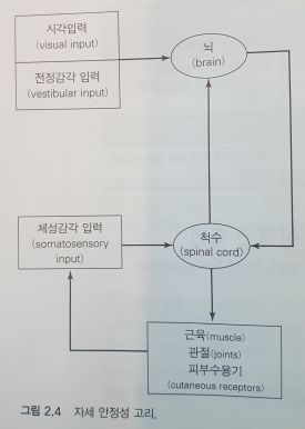 - 자세 안정성과 관련 정보 = {시각(주변 환경 정보, 수평선에 대한 눈의 관계) / 전정계(머리, 신체 위치, 피드백) / 체성감각(고유수용성 감각, 온도, 통증)} +집중력, 인지