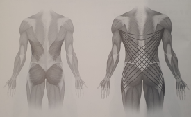 - 몸통 앞쪽 - 이두근, 대흉근, 내복사근, 반대 엉덩관절 벌림근, 넙다리빗근 / 나선형 - 마름모근, 전거근, 외복사근, 반대 내복사근, 반대 엉덩관절 모음금 / 뒤쪽 - 대둔근, 흉요근막, 반대광배근, 삼두근(엉치 엉덩관절의 안정성↑)