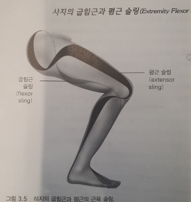 - 다리 폄근 슬링 - 대둔근, 대퇴직근, 비복근 / 굽힘 슬링 - 장요근, 햄스트링, 전경골근 / 동시에 활성화 될 때 하지는 안정