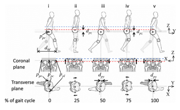 다음은 보행주기의 골반의 거상, 회전에 대한 자료입니다