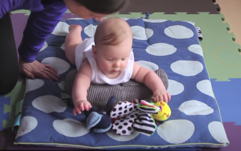 2) 손을 뻗어서 장난감을 닿을 수 있는 위치, 배와 가슴 사이 (단, 눈을 살짝 아래로 봐야 함: 이른둥이는 필수!!!)